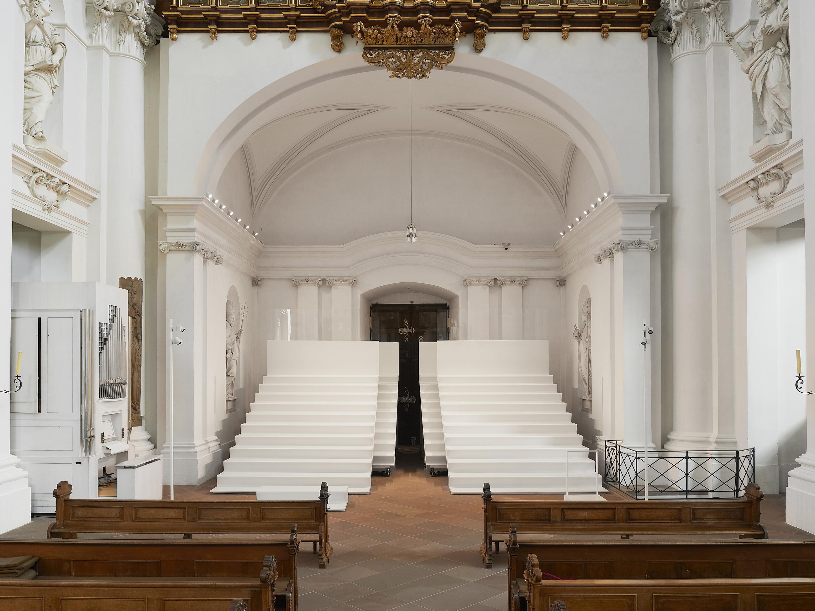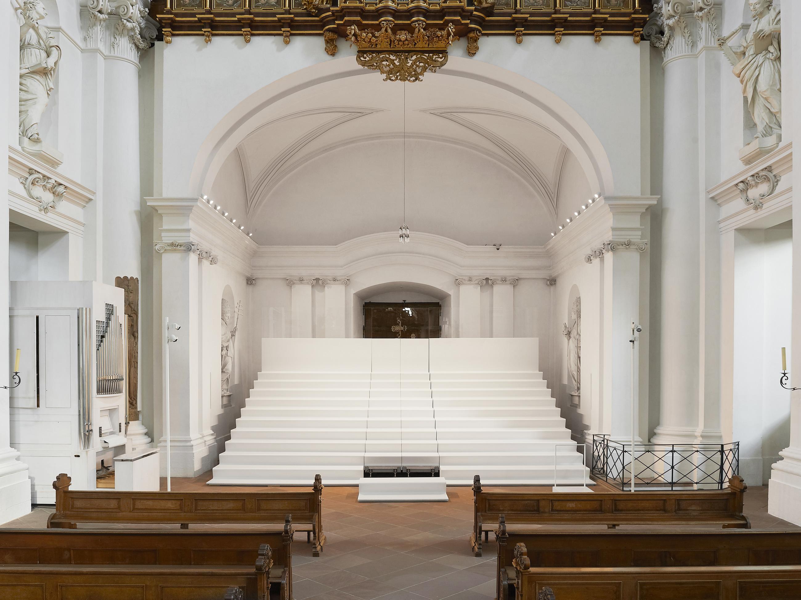 Für die Chöre am Hohen Dom zu Fulda, wurde ein Chorpodest für 200 Sänger benötigt. Dieses Podest sollte neben den klassischen Anforderungen eines abgetreppten Chorpodestes zusätzlich verfahrbar und beheizbar sein. Der Entwurf nimmt mit dem Einsatz eines matt-weißen Kunststeinmaterial und der geschwungenen Ausbildung der Podeststufen Bezug auf die größtenteils weiße Ausstattung des Doms.