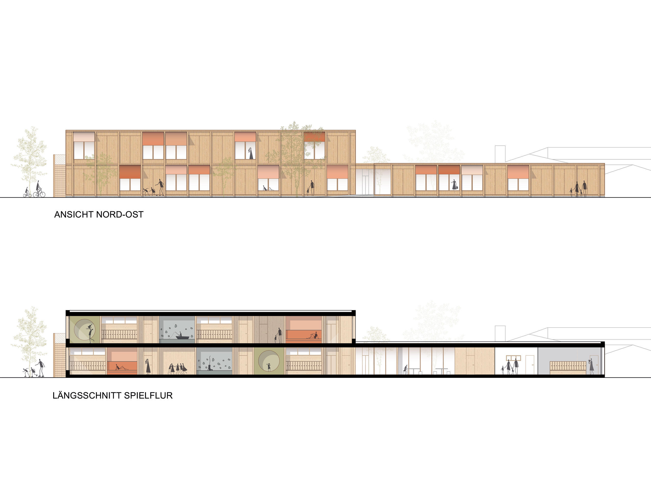 Der Entwurf zur Erweiterung der Kita in Mittelbuchen sieht einen zweigeschossigen Baukörper in Holzmodulbauweise vor, in dem sich die neuen Kitaflächen befinden. Über einen großen Spielflur sind die einzelnen Gruppenräume miteinander verbunden, der als eine offene Vorzone fungiert und unterschiedlich zoniert und gestaltet werden kann. Die Anbindung der neuen Kitaräume an den Bestand erfolgt über einen eingeschossigen Mittelbau. In ihm befindet sich der neue zentrale Eingangsbereich, sowie die Räumlichkeiten für die Mensa und ein kleines Elterncafé.