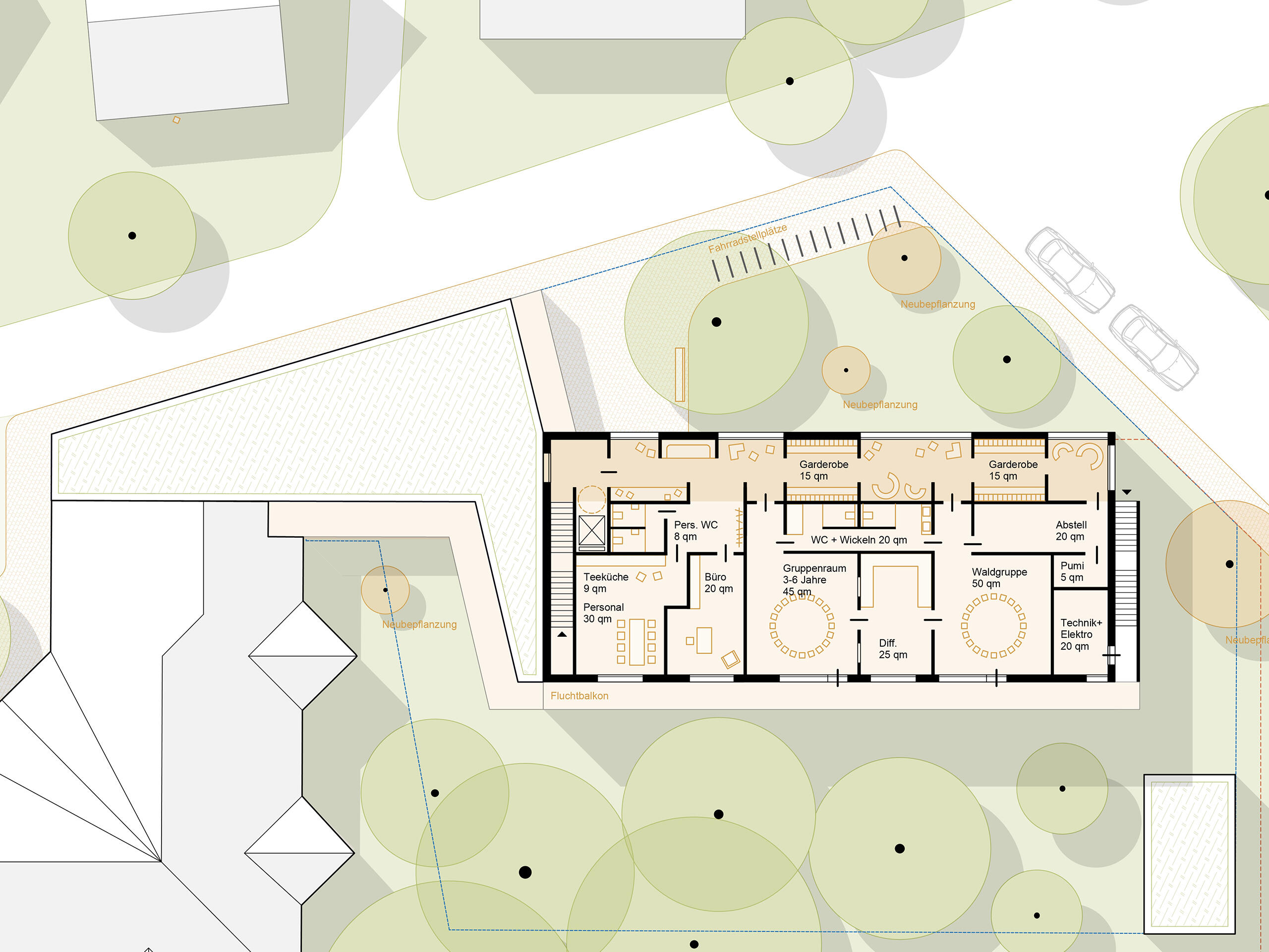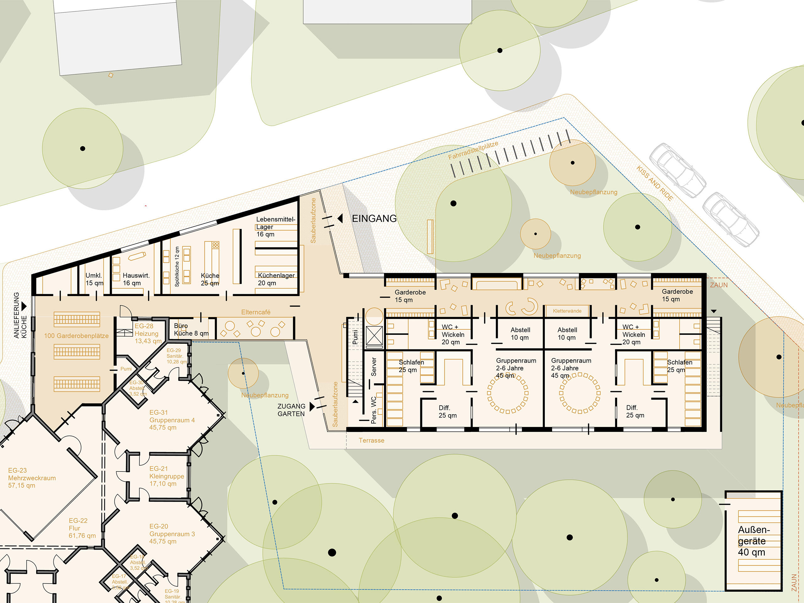 Durch die städtebauliche Setzung der Erweiterungsbauten wird die Grünfläche der Kita nach Südwesten im Verbund mit dem Bestand gerahmt. Durch diese geschickte Abgrenzung zu den öffentlichen Straßenbereichen und die gleichzeitige Öffnung des Gebäudes zu der Grünanlage entsteht für die Kinder ein geschützter Außenraum zum Spielen und Entdecken.